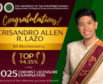 Crisando Allen R. Lazo, a BS Biochemistry alumnus of the Department of Physical Sciences and Mathematics, CAS, UP Manila, topped the 2025 Chemists Computer-based Licensure Examination of the Professional Regulation Commission (PRC). Lazo got a score of 94.35% ranking FIRST among the 842 passers, and 1,150 exam takers. He is the 5th BS Biochemistry alumnus […]